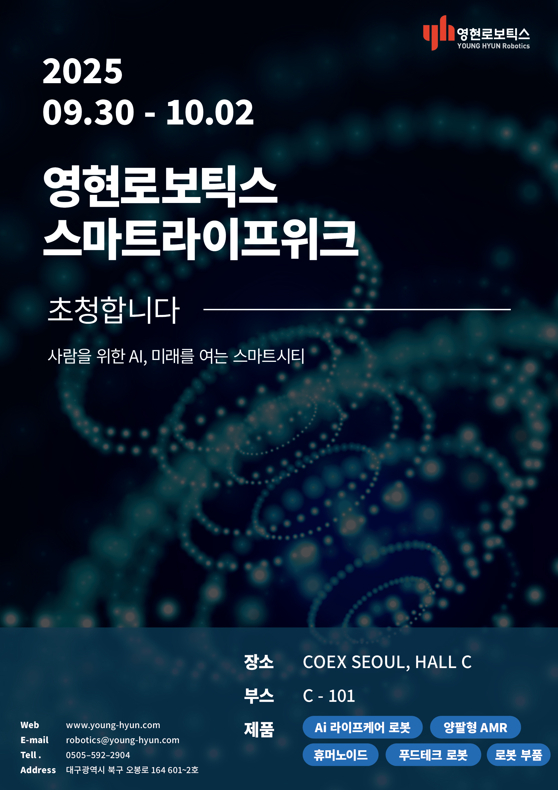 영현로보틱스는 서울 코엑스에서 2025년 9월 30일부터 10월 2일까지 열리는 스마트라이프위크에 초청합니다.