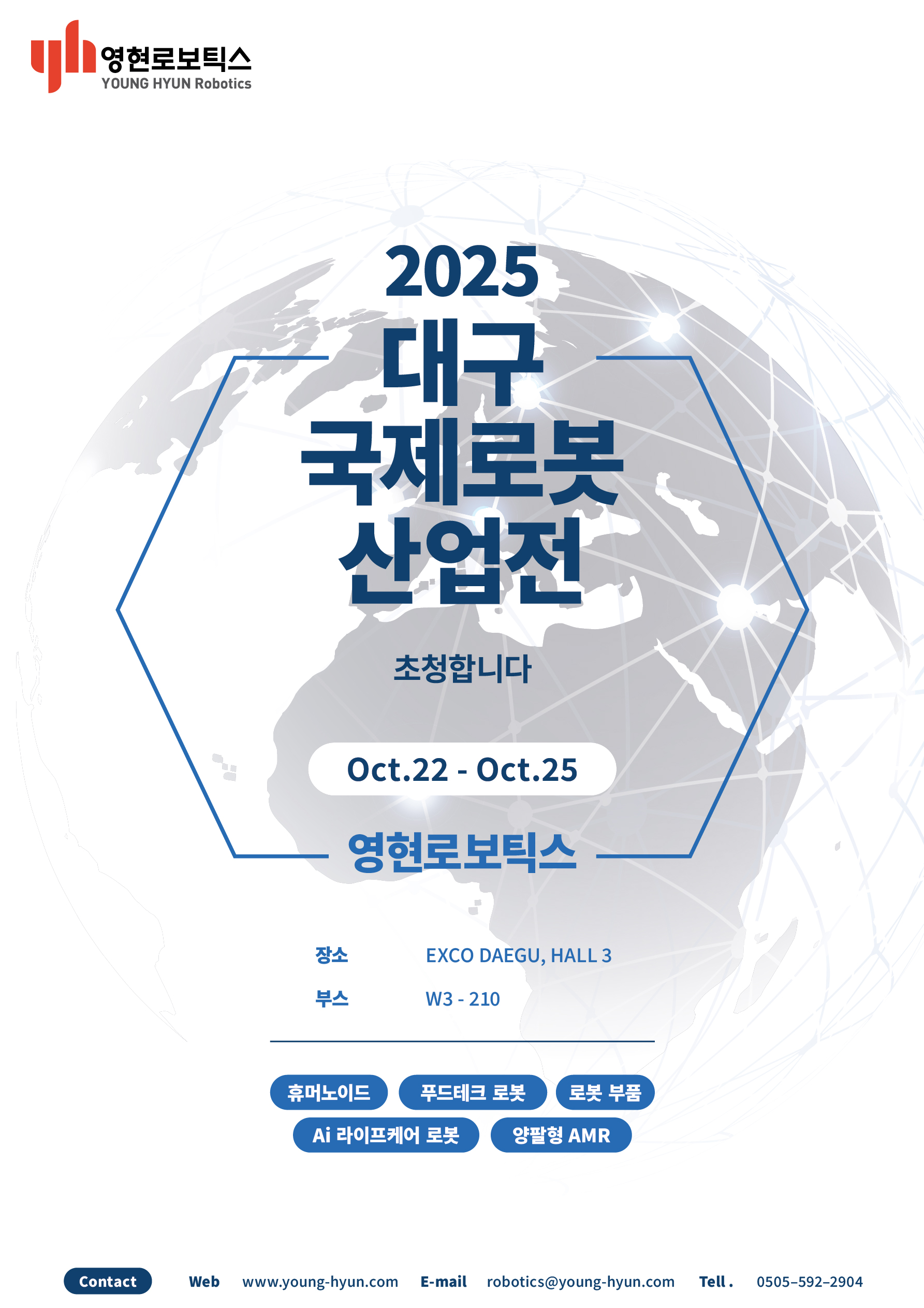 영현로보틱스는 대구 엑스코에서 2025년 10월 22일부터 10월 25일 까지 열리는 [2025 대구 국제로봇산업전]에 참여합니다.